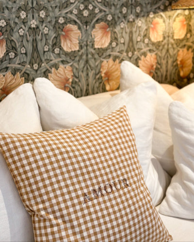Prénoms, initiales, messages, Mezzanine brode vos mots doux sur une sélection de linge de maison. Nous réalisons les broderies directement en boutique avec notre typographie signature, composée de lettrines anciennes.