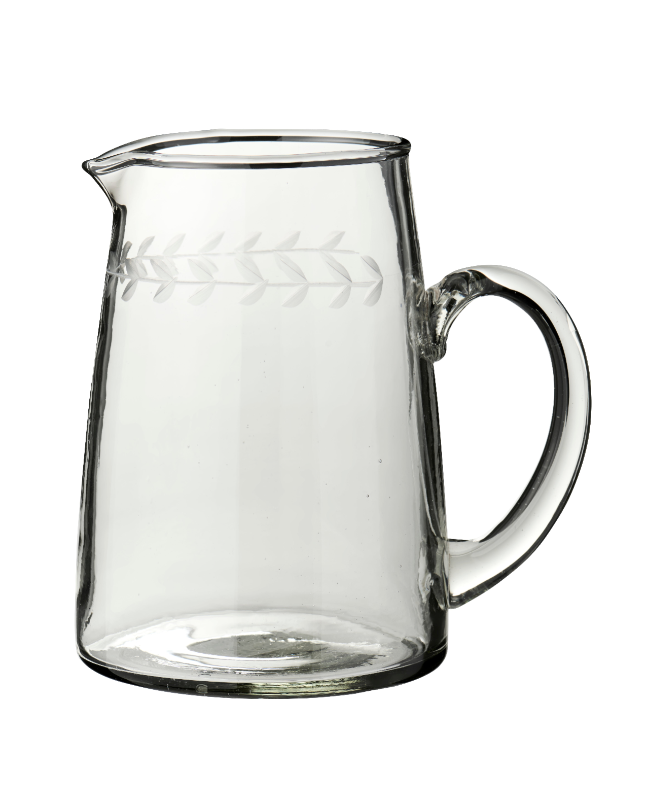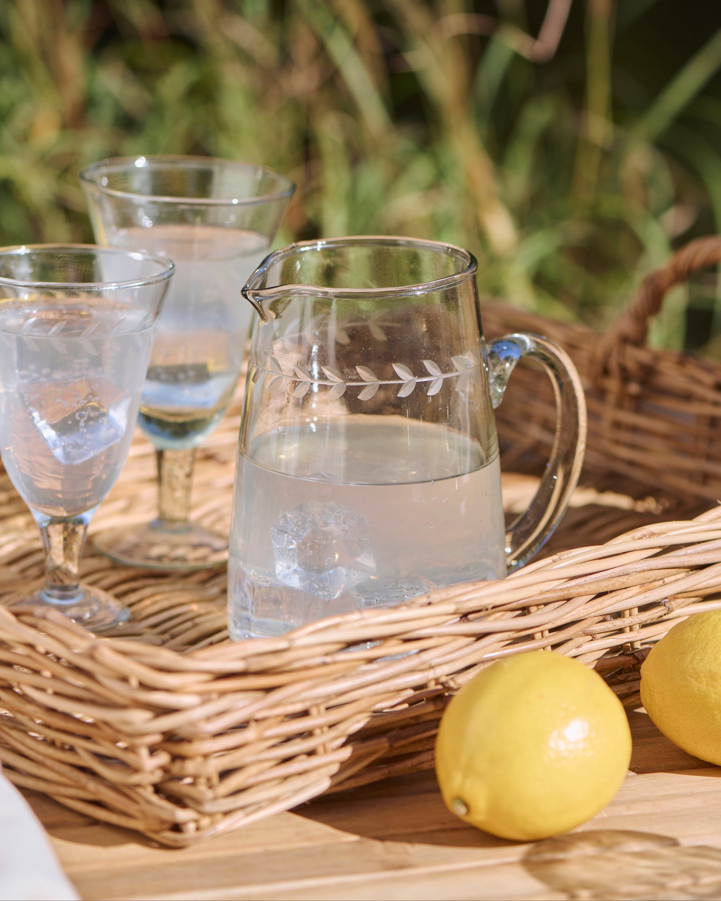 Cette carafe en verre délicatement gravée de motifs de feuilles apporte une touche naturelle et raffinée à votre table, alliant transparence, finesse et poésie.